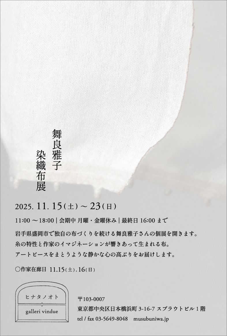 岩手県盛岡市で独自の布づくりを続ける舞良雅子さんの個展を開きます。