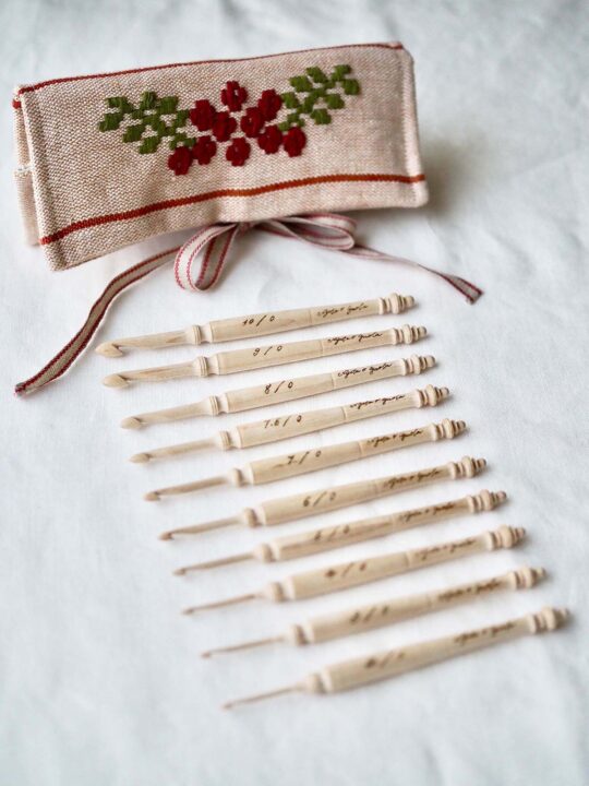 2号・3号・4号・5号・6号・7号・7.5号・8号・9号・10号の10サイズのかぎ針を、手織りのケースに収めました。