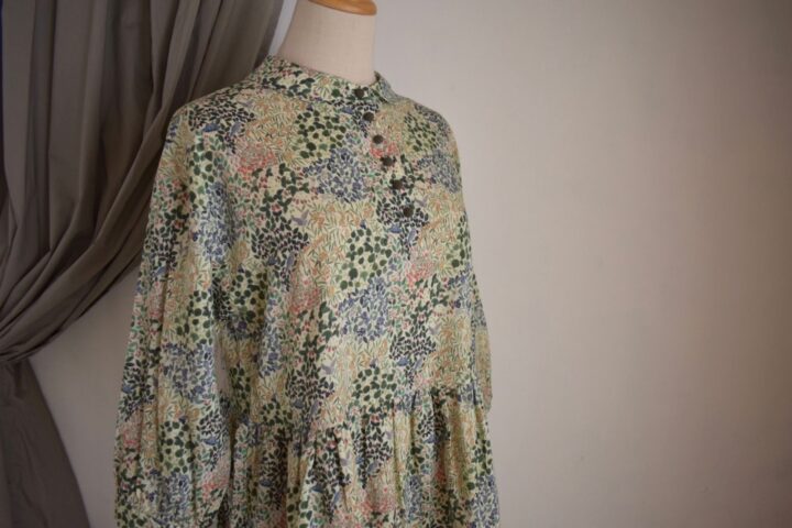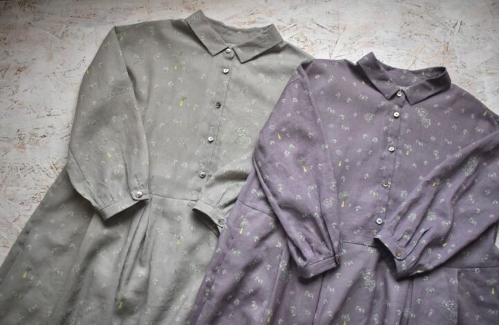 また、プリント生地は、昨年ご好評をいただき、早々に完売となった「かすみ草とバラ」を、新たな色合いでお洋服として制作しました。