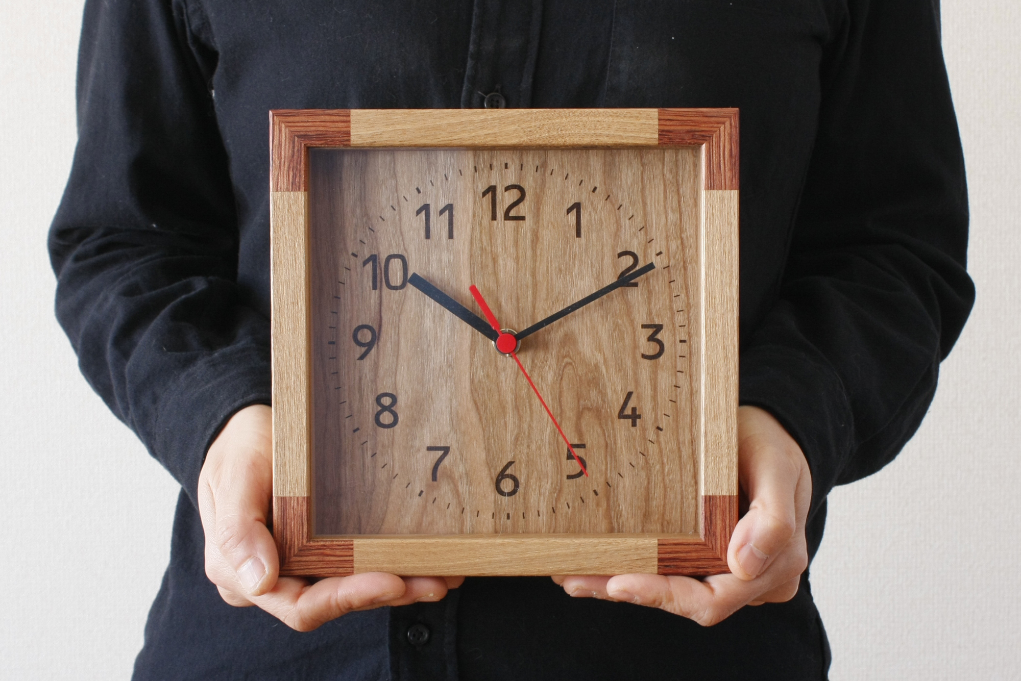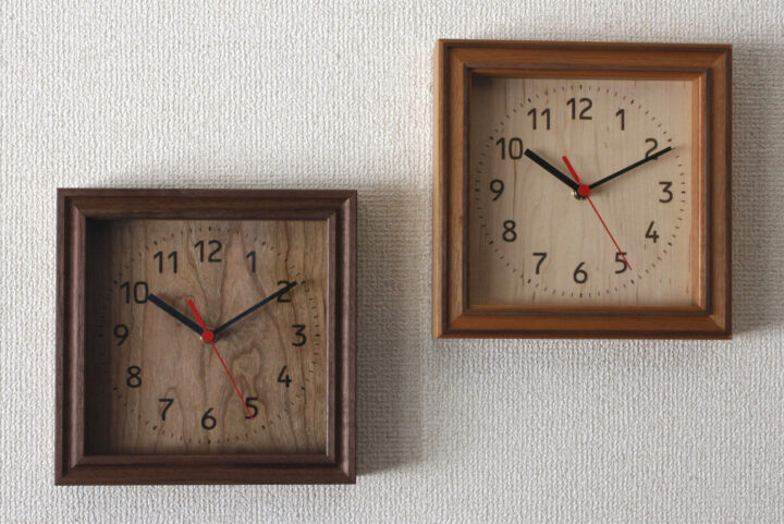 文字盤はメープル、タモ、チェリーなど様々な樹種に、レーザーで刻印しています。
