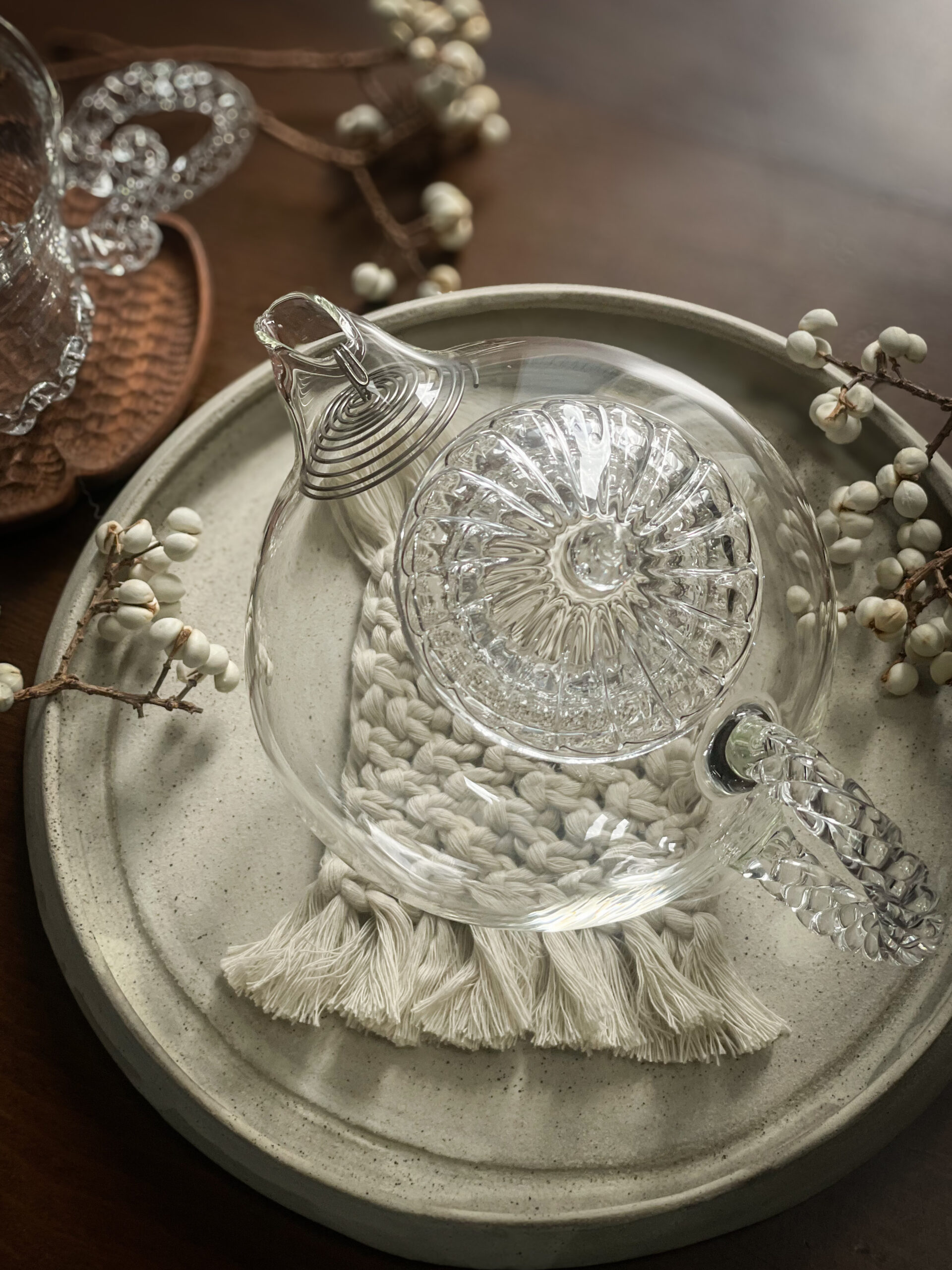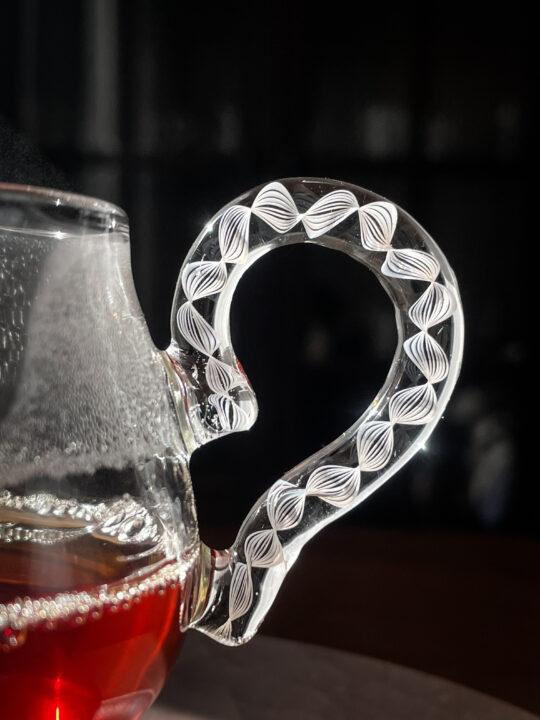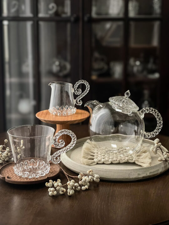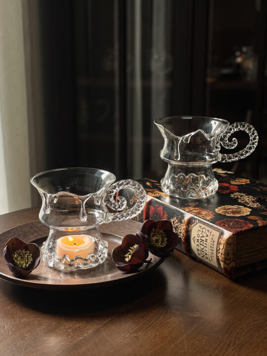 耐熱ガラスで制作したポットやマグ、キャンドルのようなオイルランプ。